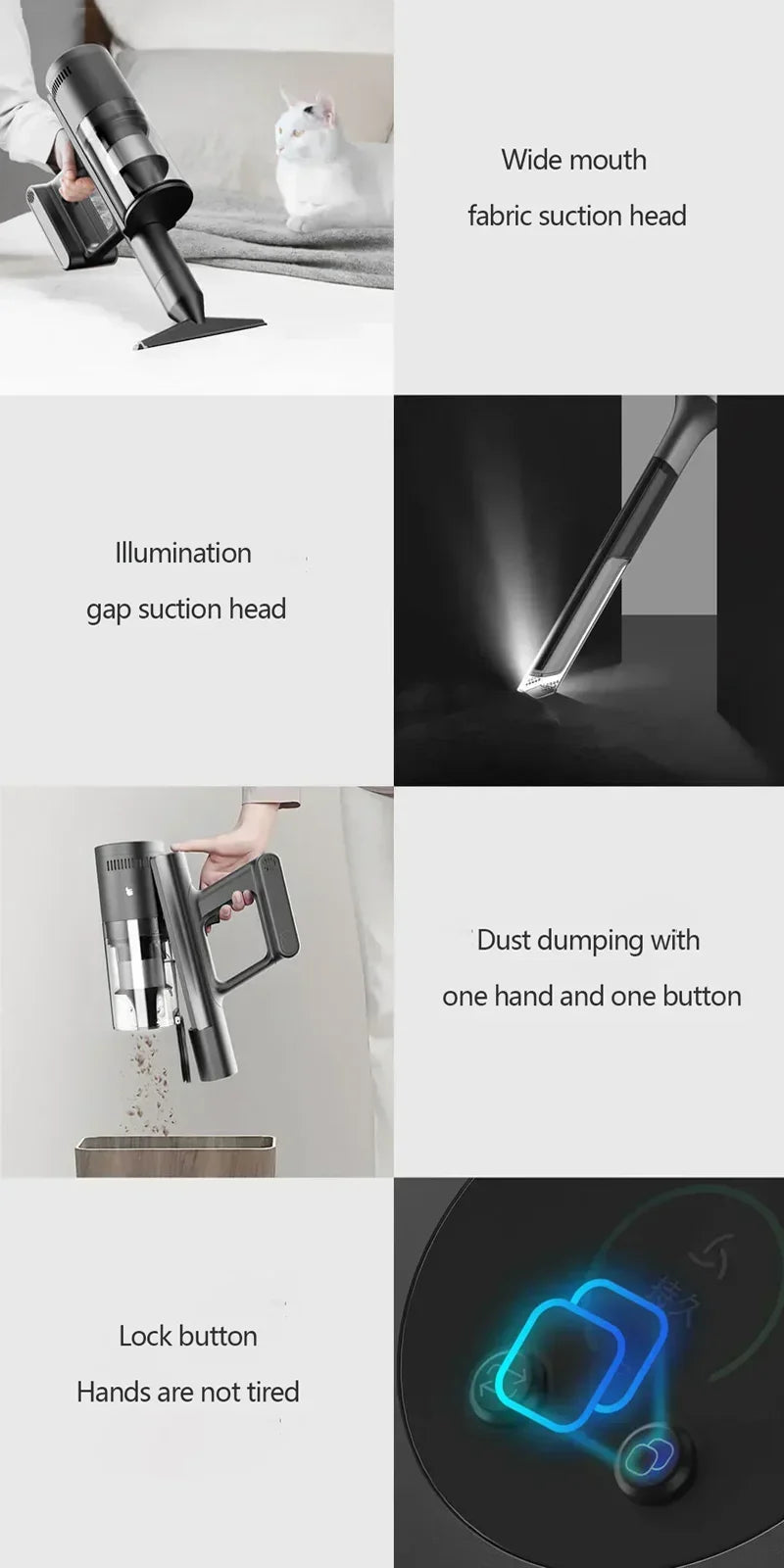 Incluye boquilla especial para ácaros, filtro HEPA y pantalla LCD para un control intuitivo. Su diseño portátil e inalámbrico facilita la movilidad en cualquier espacio, con un peso ligero de 3,7 kg que asegura comodidad en cada uso.