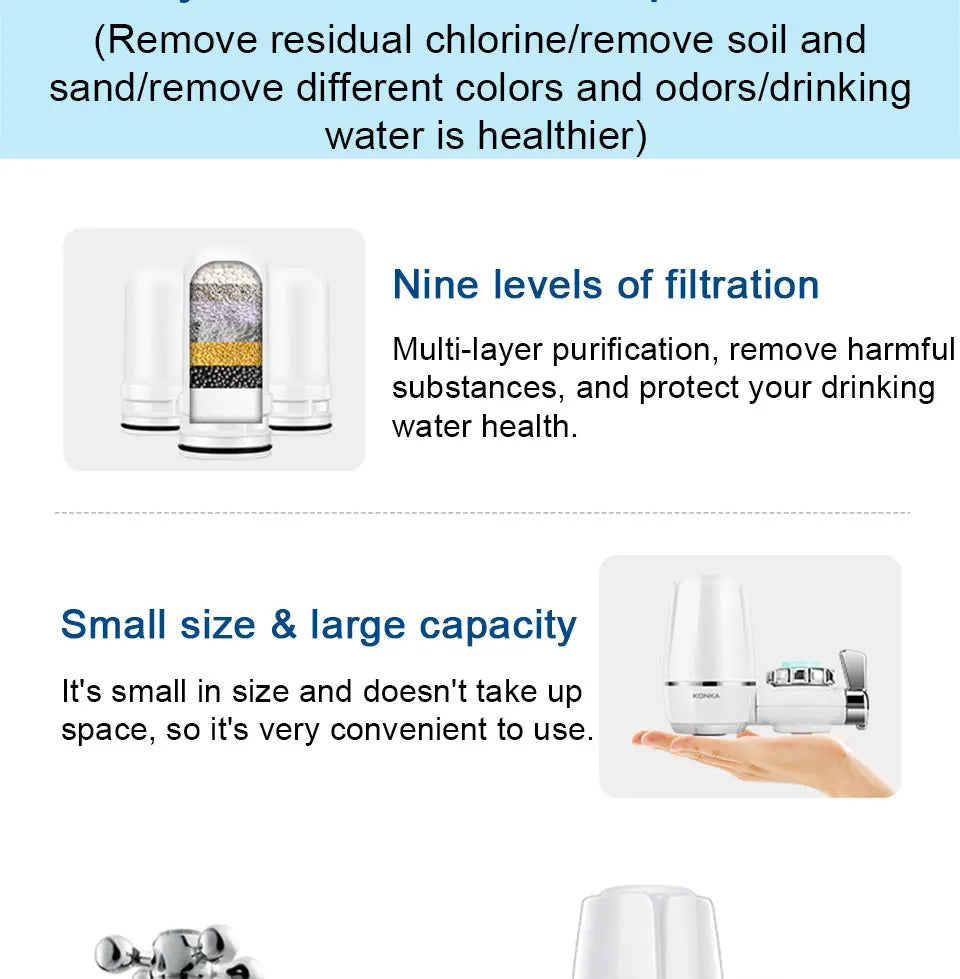 El filtro compuesto de cerámica y carbón activado asegura una purificación profunda de nueve etapas, manteniendo los minerales esenciales del agua. Además, su elemento filtrante reemplazable y lavable prolonga la vida útil del dispositivo, convirtiéndolo en una opción económica y sostenible.