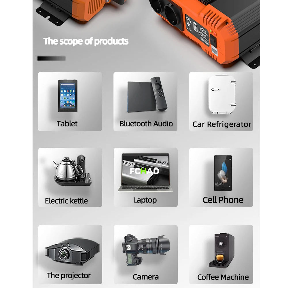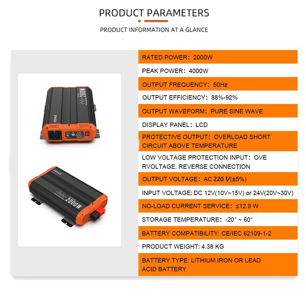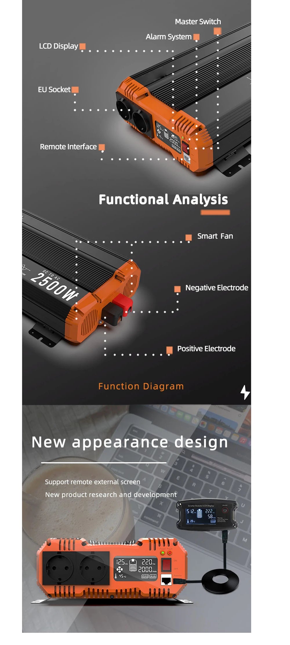 El inversor de potencia de onda sinusoidal pura 5000W es la solución ideal para transformar la energía de 12V/24V CC a 220V/230V CA, ofreciendo un rendimiento estable y seguro tanto en el hogar como en vehículos y autocaravanas (RV). Con una potencia continua de 2500W y una máxima de 5000W, garantiza el funcionamiento de una amplia gama de aparatos eléctricos, incluyendo televisores, luces LED, monitores LCD, refrigeradores y cocinas de inducción.