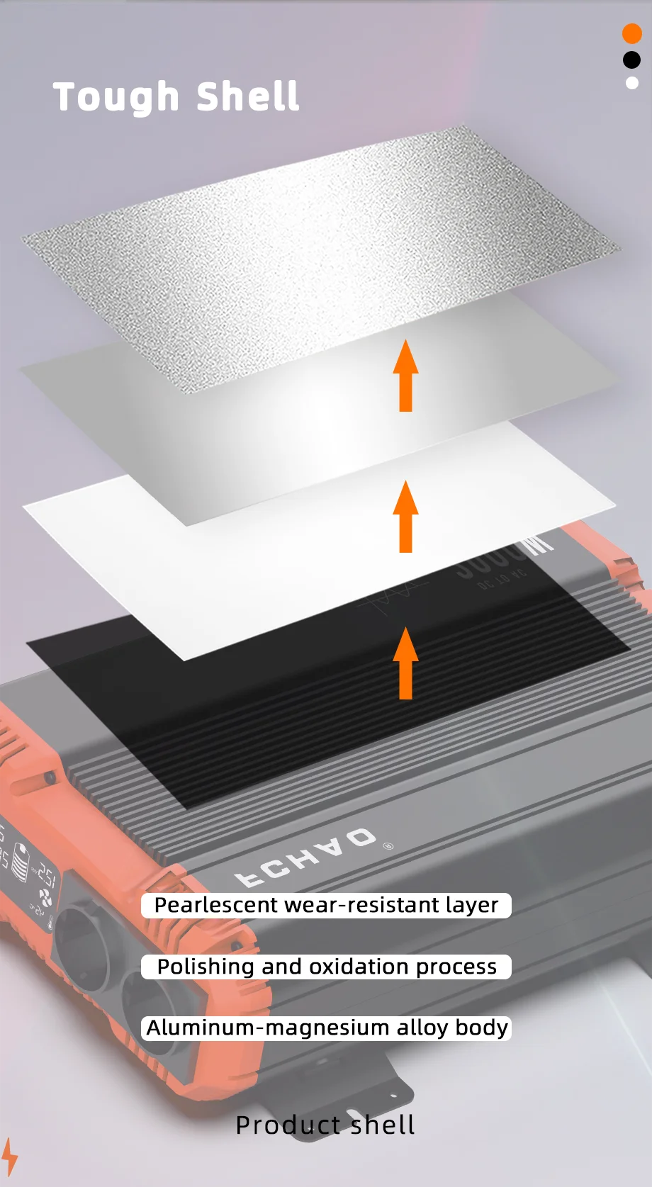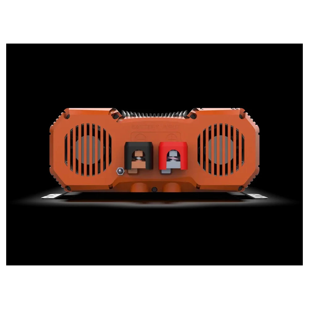 El inversor cuenta con un panel de control remoto con cable de 3 metros, que permite encender y apagar el dispositivo, así como visualizar el voltaje y la potencia en tiempo real. Su carcasa de aleación de aluminio-magnesio con disipador de calor de alta calidad y conductos de aire dobles garantiza una excelente refrigeración y durabilidad incluso en usos prolongados.