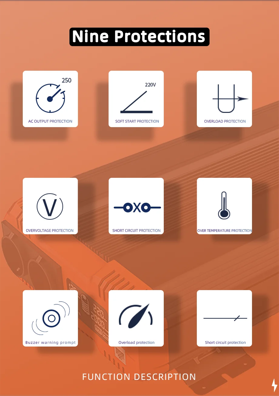 Su eficiencia de conversión de hasta el 95% reduce el consumo energético y prolonga la vida útil de la batería. Además, incorpora un sistema de protección inteligente con alarma sonora, que desconecta automáticamente la carga en caso de sobrecarga o fallo, asegurando la máxima seguridad.
