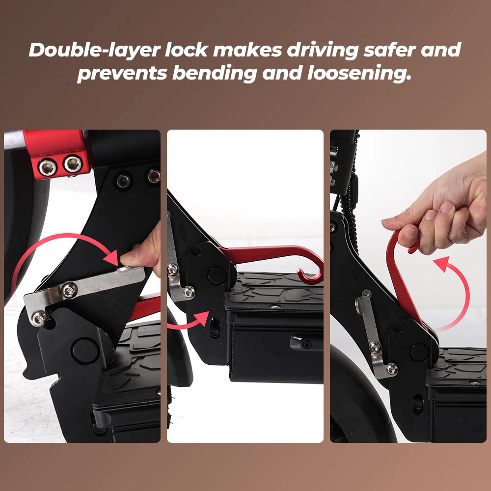 Su diseño incorpora neumáticos todoterreno de 10 pulgadas, perfectos para adaptarse a diferentes superficies, junto con un sistema de doble absorción de impactos delantero y trasero que garantiza una conducción suave y cómoda. Además, cuenta con frenos de disco duales y sistema de frenado electrónico, proporcionando una seguridad avanzada en cada trayecto.
