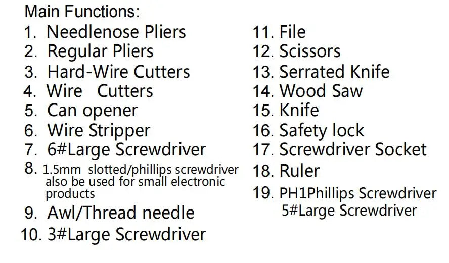 Este completo set incluye cuchillo plegable, tijeras EDC, alicates, abridor de latas, raspador, destornilladores y archivo, todo en un diseño compacto y portátil. Sus componentes están elaborados en aleaciones de cromo y tungsteno de alta dureza, garantizando un rendimiento óptimo en cualquier situación.