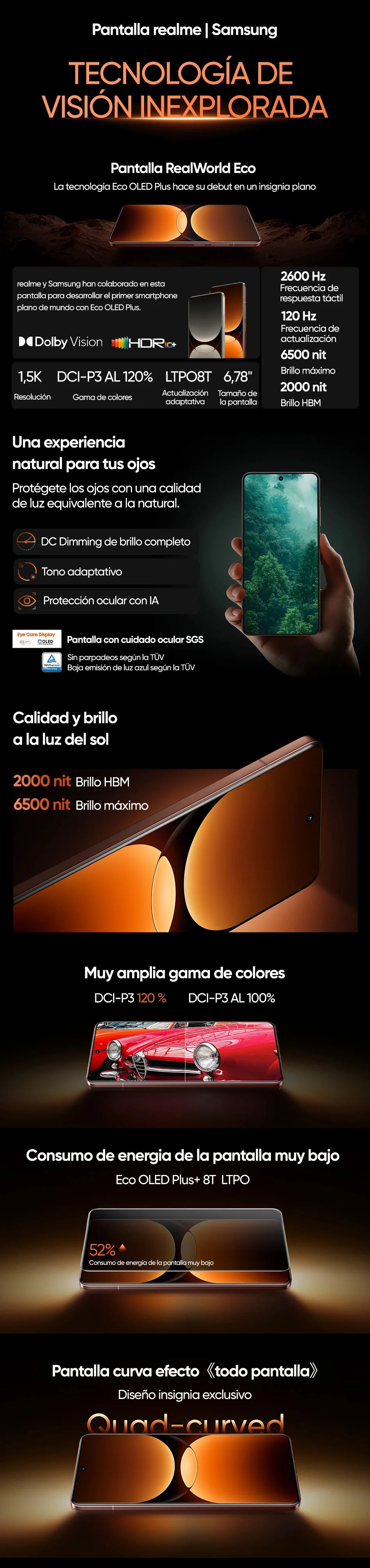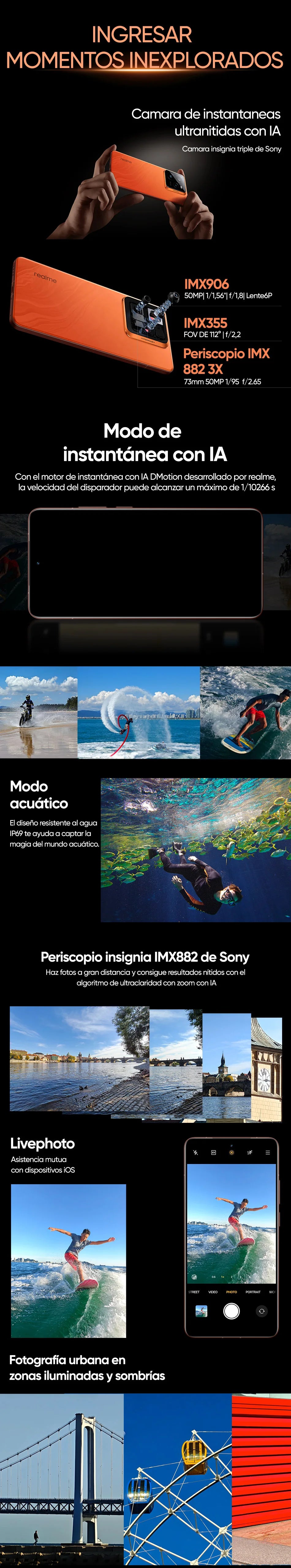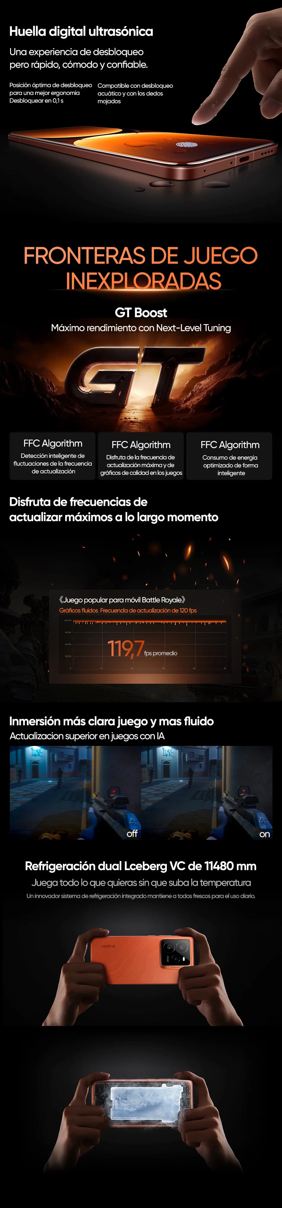 Su diseño en vidrio y aleación de aluminio, disponible en colores rojo Marte, titanio Star Trail y blanco Light Range, aporta un acabado premium. El escáner de huellas ultrasónico bajo pantalla y la interfaz Android 15 con Realme UI 6.0 completan una experiencia de usuario avanzada.