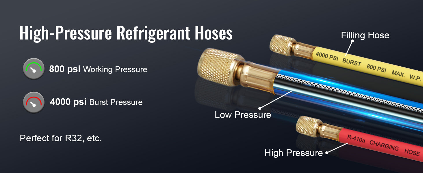 Este kit incluye un juego de manómetros de colector premium, diseñados para ofrecer lecturas precisas de presión y un uso seguro en refrigerantes como R32 y R134a. La manguera de 3 colores de alta resistencia soporta presiones de hasta 4000 PSI, asegurando durabilidad y un sellado a prueba de fugas.